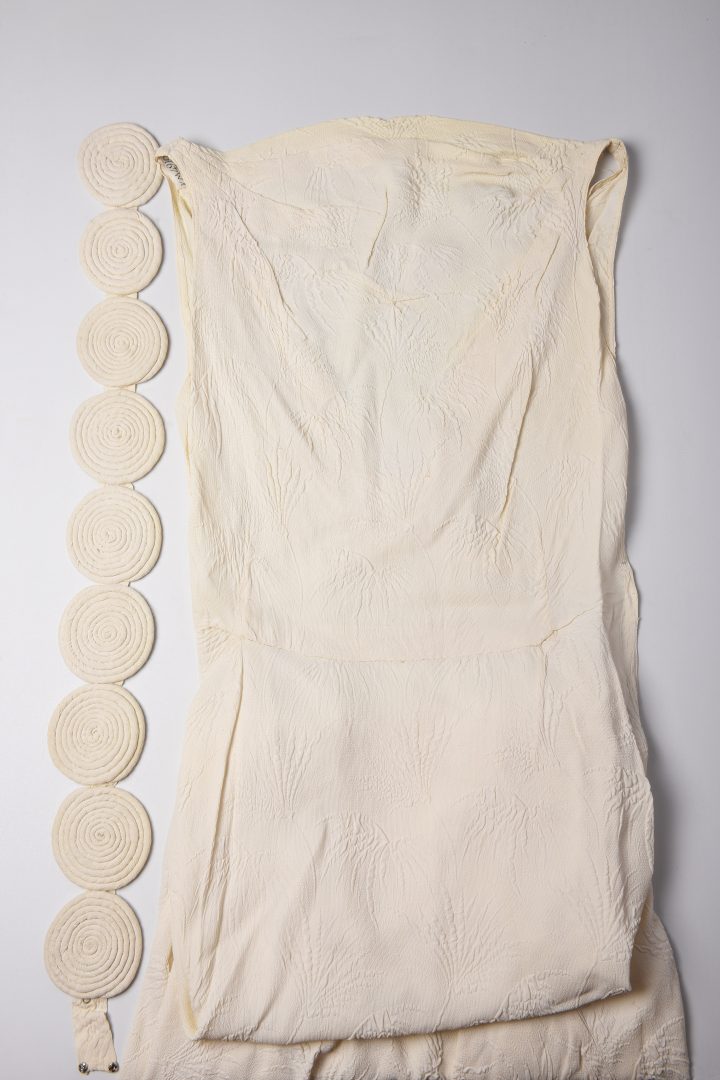 En vit ärmlös aftonklänning med bar rygg. Materialet är konstsilke och tekniken är cloqué, en dubbelvävning med mönster i rynkeffekt. En skråskuren våd är infälld i kjolens nederkant. Skärpet består av nio tygklädda rundlar.