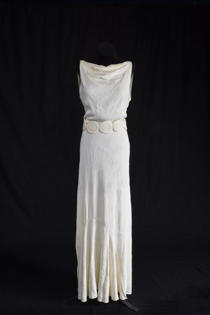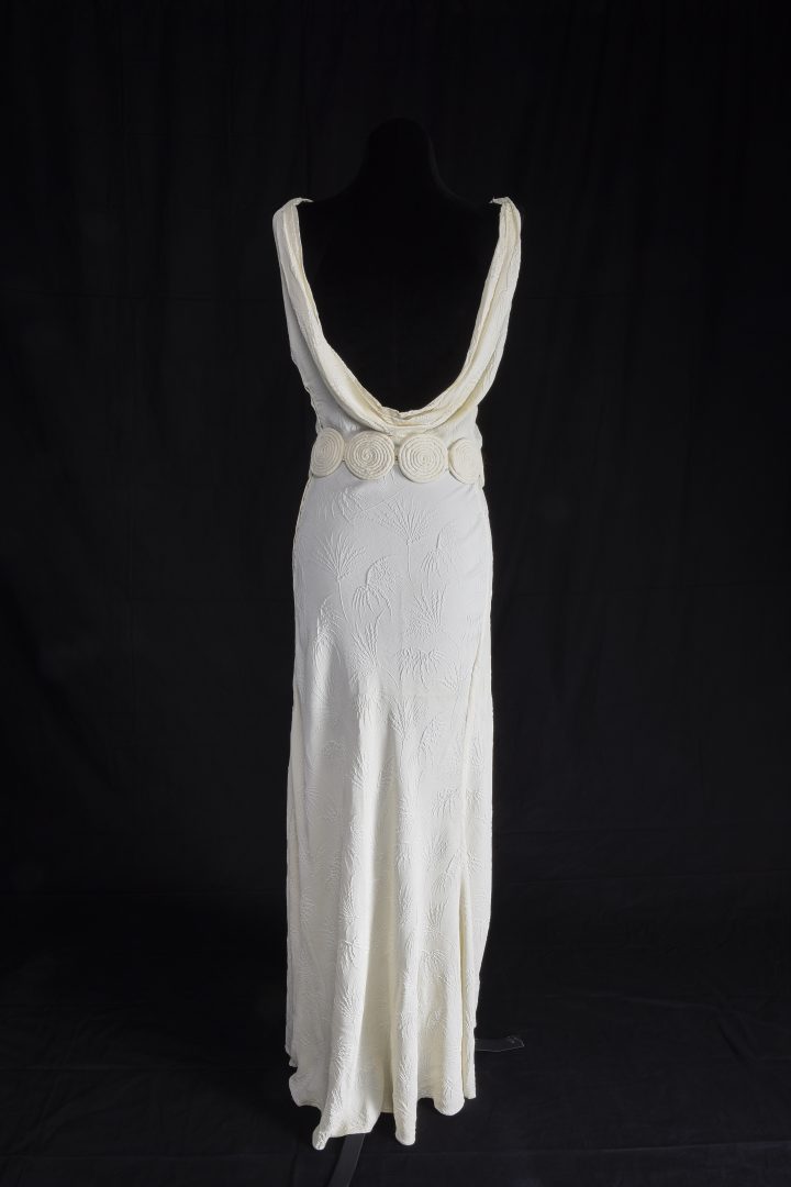 Den här klänningen följer kroppens former på ett för tiden typiskt sätt. Idealet var en slank men kurvig figur. Tyget skars på skrådden, det vill säga snett, för att på bästa sätt följa kroppens former. Tygerna var ofta blanka och följsamma. Ryggskärningen är väldigt djup. Före 1930-talet var det otänkbart att visa så mycket av ryggen. Klänningen har troligen använts utan behå under.