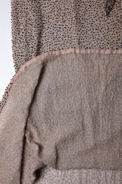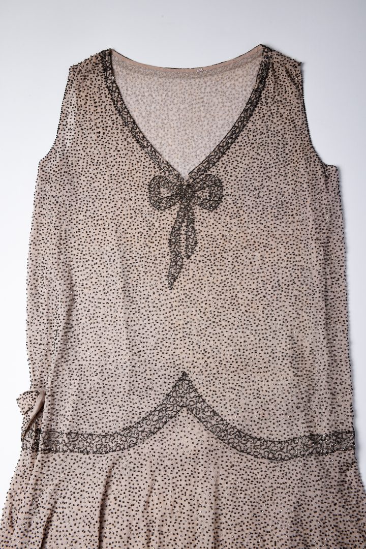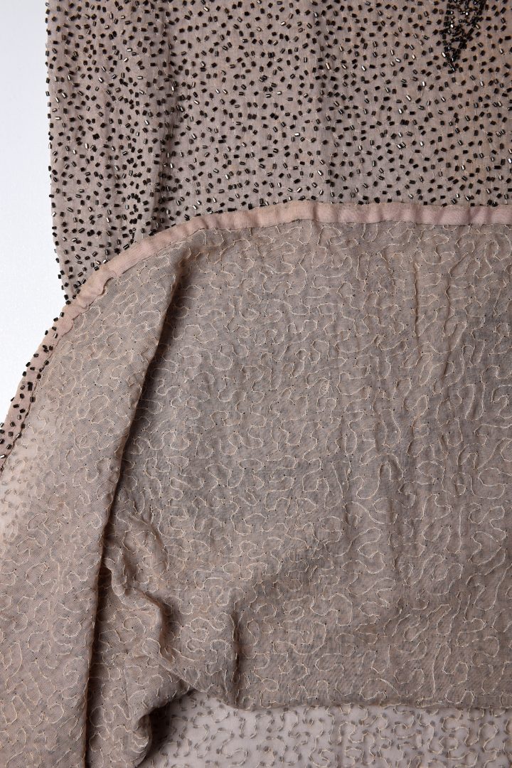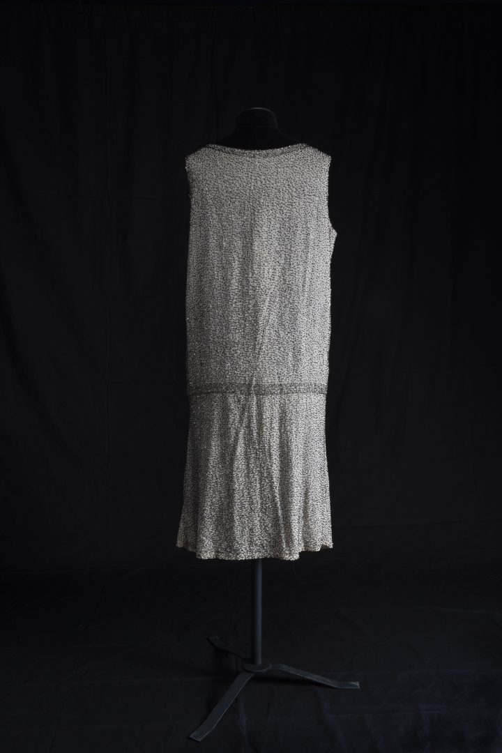 En kort ärmlös crèpeklänning i konstsilke med broderier av stavpärlor. Kulturens konservator har sytt på ett stödtyg under klänningen så att den tunna crèpen ska klara tyngden av alla pärlor. Flera andra fantastiska klänningar från 1920-talet har tyvärr fått stanna i magasinet, de klarar inte att bära sin egen tyngd.