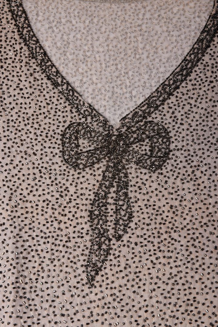 Klänningens urringning med en rosett broderad i stavpärlor. -