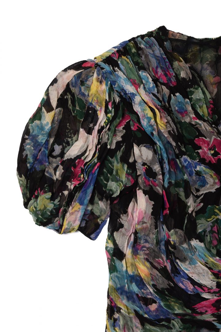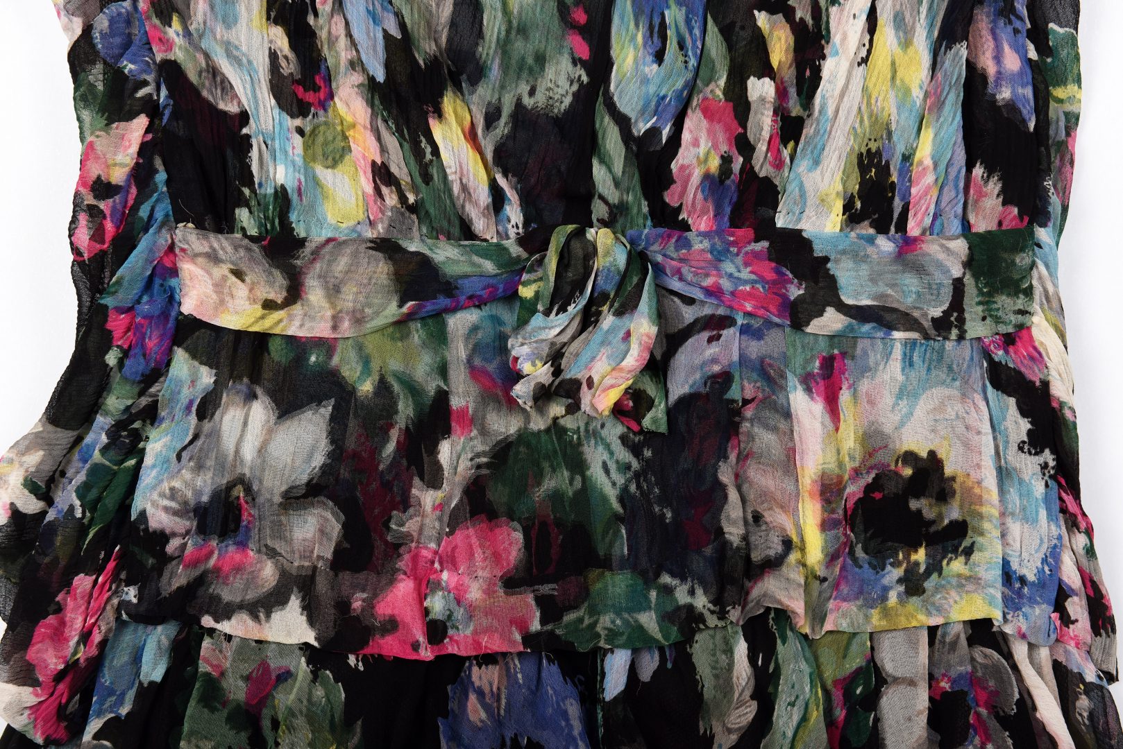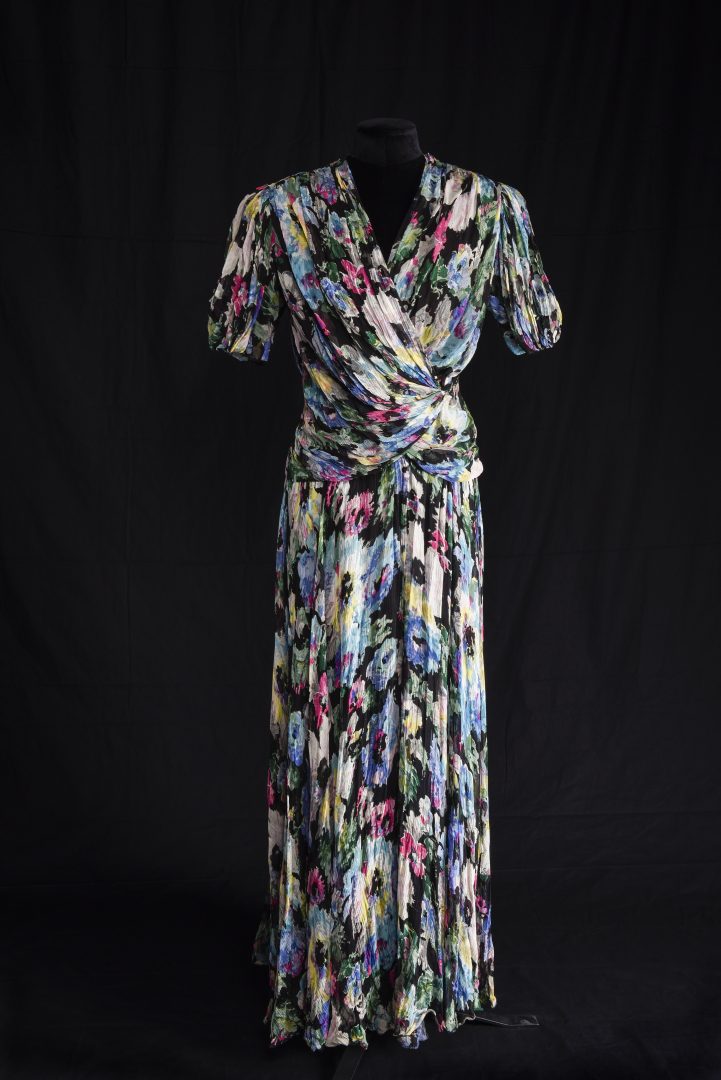 En aftonklänning i mörk chiffong med stora, diffusa, färgglada blommor. Den har omlottdraperat liv och utbyggda axlar