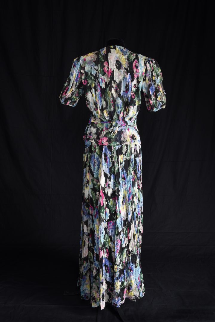 Den här aftonklänningen har tidstypiska utbyggda axlar. Breda axlar signalerar makt och pondus. Uniformernas utbyggda axlar var högsta mode även bland kvinnor under andra världskriget. Kvinnor arbetade då ofta inom traditionellt manliga yrken. Här är de breda axlarna kombinerade med ett kvinnligt blommigt mönster och mjuka draperingar.
