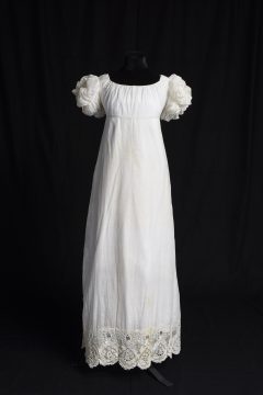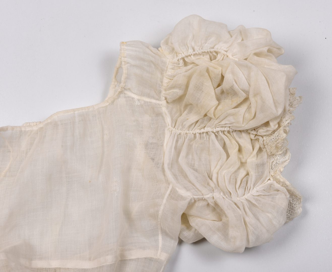 En klänning av tunn bomullsbatist. Bården nertill är broderad i klumpsöm och har en infälld knypplad spets. Puffärmen är rynkad med dragsko och nertill garnerad med knypplad spets.
