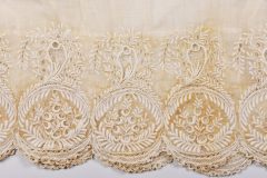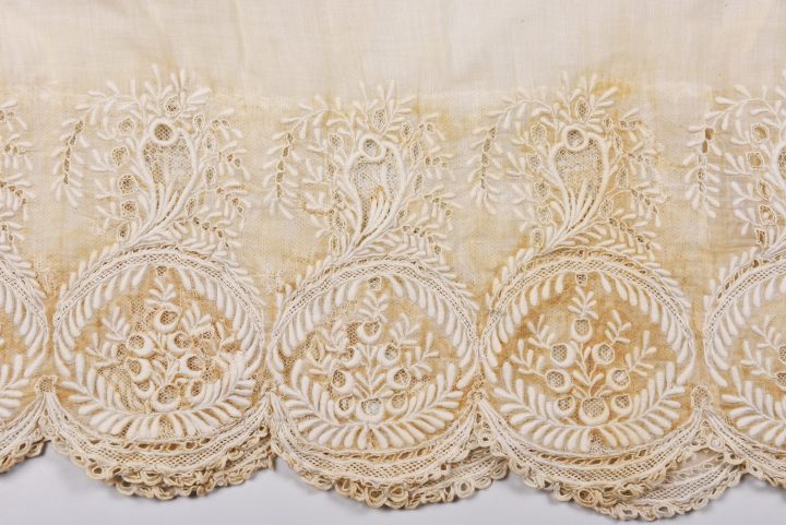 Klänningens nederkant med broderi av klumpsöm med infälld knypplad spets. Hela klänningen var ursprungligen vit men med tiden har delar av klänningen blivit missfärgade.