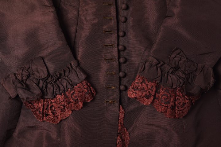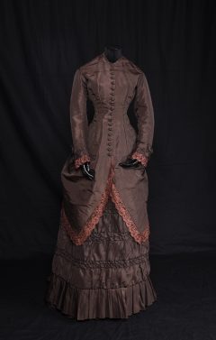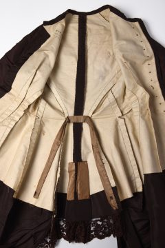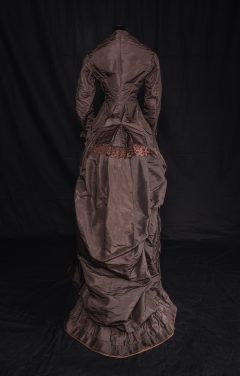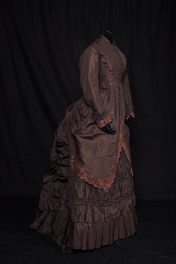 Tyget är en brun sidenrips med dekor av bruna maskinvävda tyllspetsar. Kjolen har ett litet släp och fodret är rynkat på stussen för att skapa stor volym över turnyren.