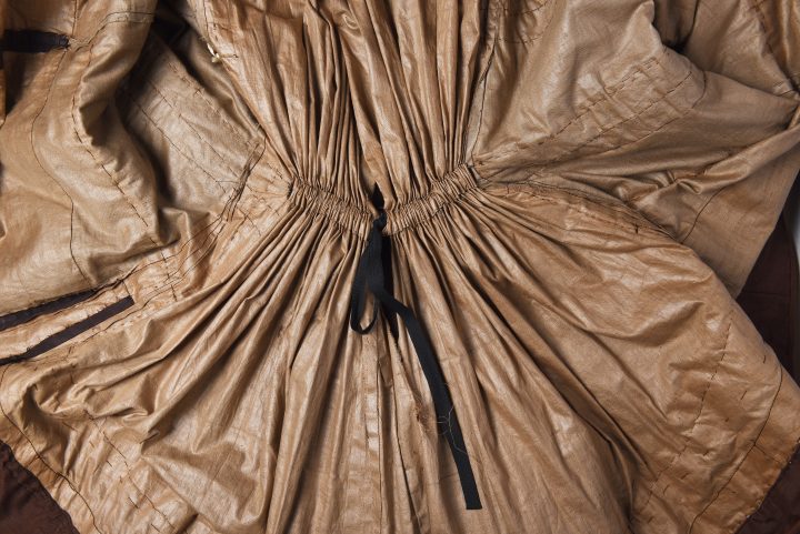 Kasacken är fodrad med kraftig bomullslärft. Ett band av beige glättad bomull knäpps om midjan. -