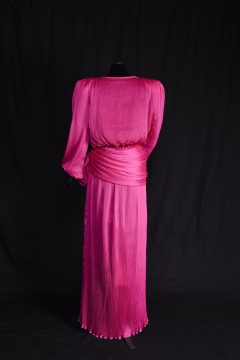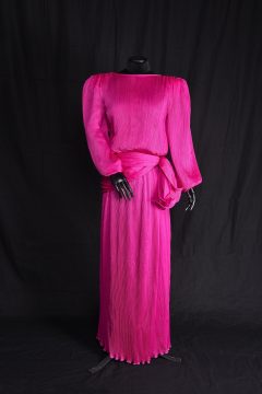 De starkt markerade axlarna kom tillbaka under 1980-talets yuppie-era med överdrivet stora axelvaddar. Det var kroppsfixering med workout och bodybuilding som gällde. Färgerna var ofta starka, gärna cerise som här, eller neonfärger. Aftonklänningen är designad av den japanske modeskaparen Yuki. Den är köpt i Köpenhamn och buren vid kung Carl XVI Gustafs 40-årsmiddag 1986.