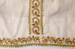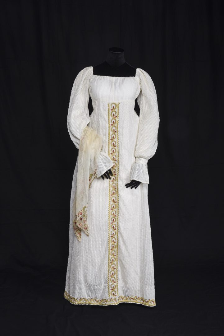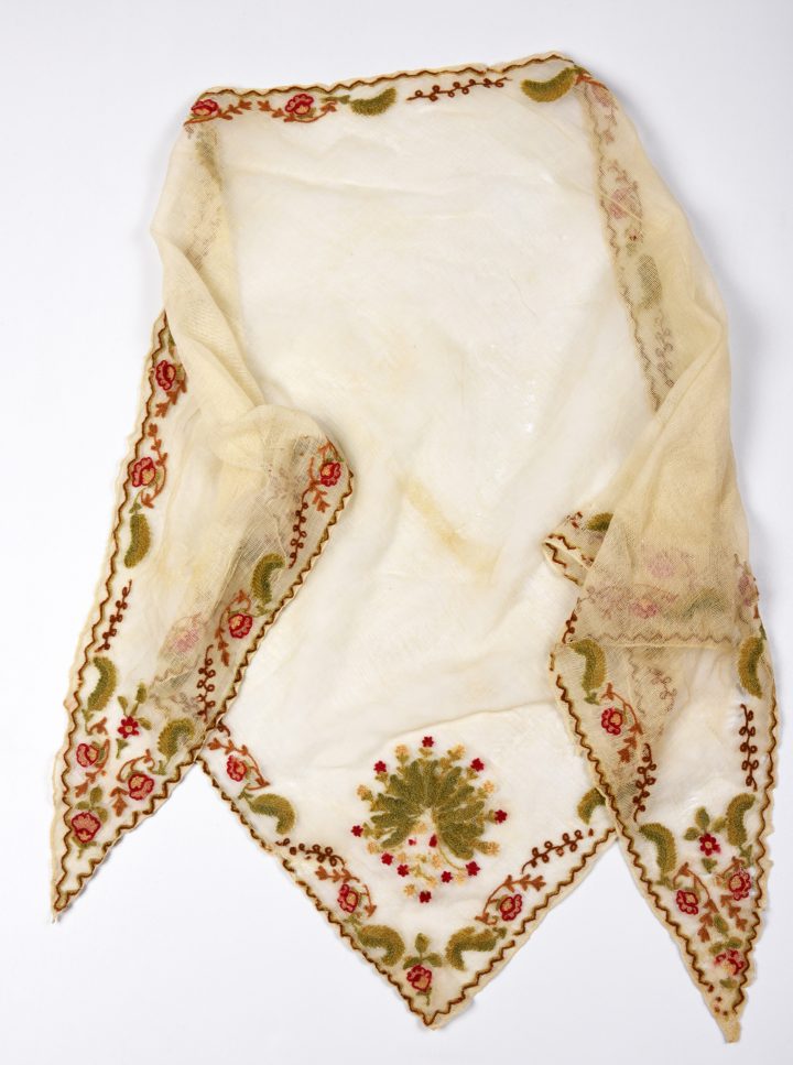 Sjalen blev modern under empiren och användes allt mer under kommande årtionden. Den här är tillverkad av tunt, glesvävt bomullstyg och har broderier i tambursöm i tunt ullgarn.