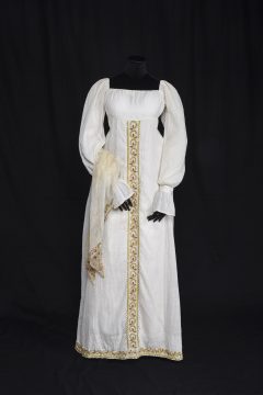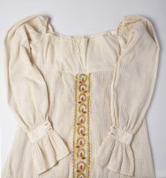 Bomullsklänningen är rak och avskuren under bysten. Den är sydd i noppväv med yllebroderier i tambursöm. Den är importerad från Frankrike antingen färdigsydd, eller som färdigbroderade och tillskurna delar som syddes samman i Sverige.