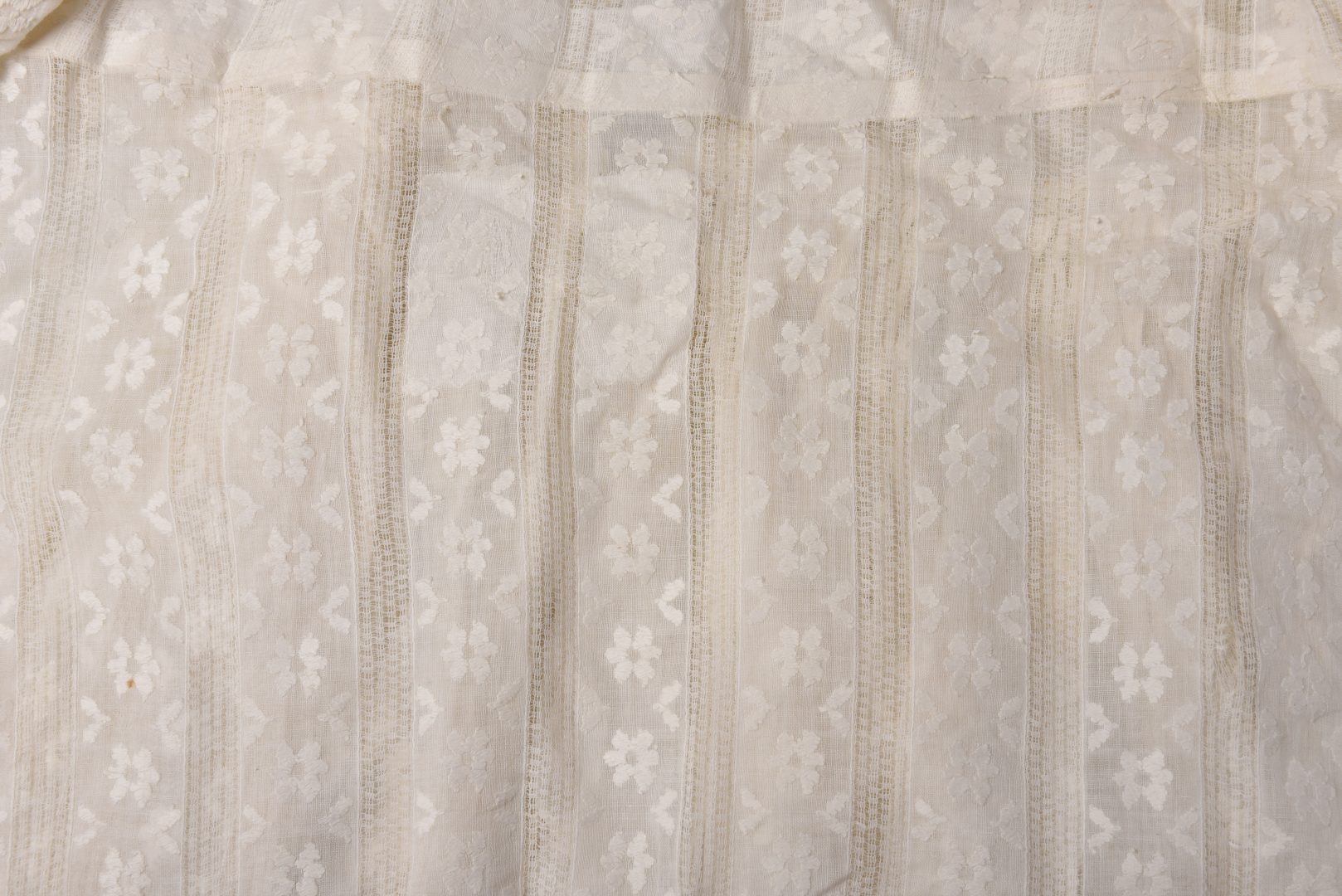 Klänningens tyg är en vit bomullsvoile med genombrutet randmönster och däremellan invävda blommor. -