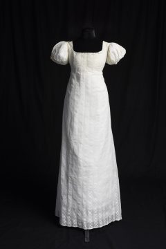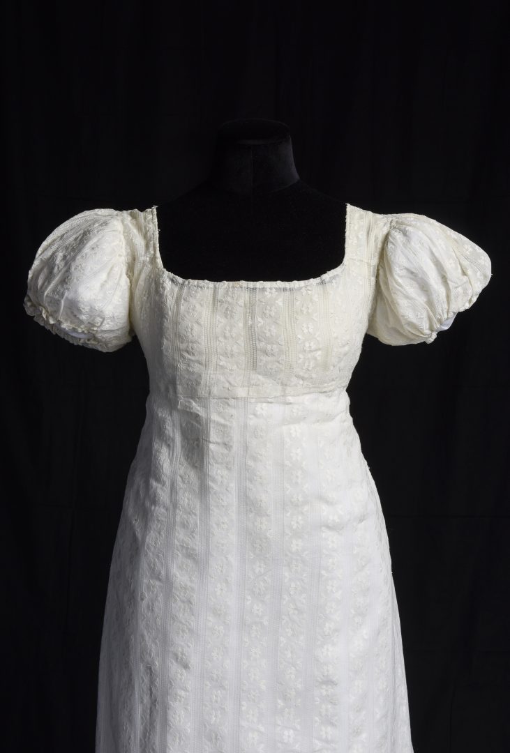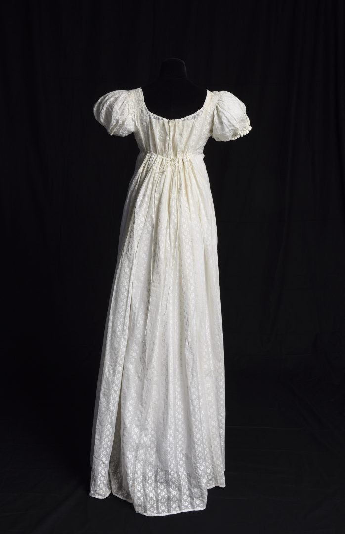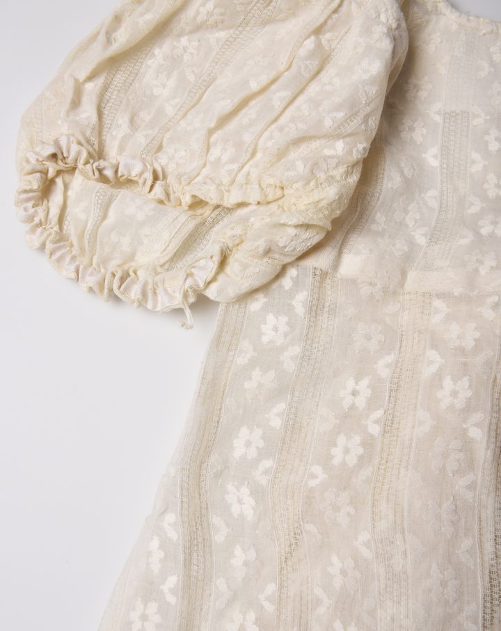 Klänningen har en kort puffärm och är avskuren under bysten. Den är sydd i vit bomullsvoile med genombrutet randmönster och däremellan invävda blommor.