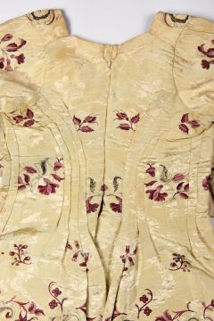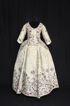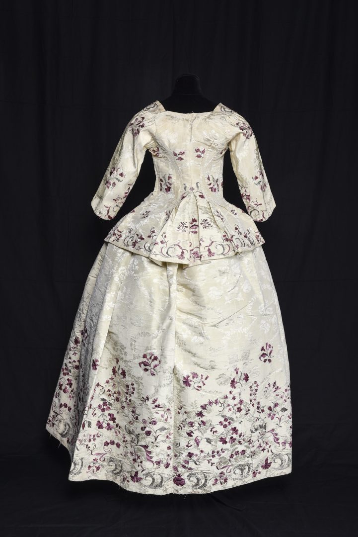 Tyget är påkostat, en mönstervävd sidenrips. Broderierna är omfattande och utförda med dyrbar silvertråd och silke. Enligt lundafamiljen som skänkt dräkten, ska den ha burits vid hovet.