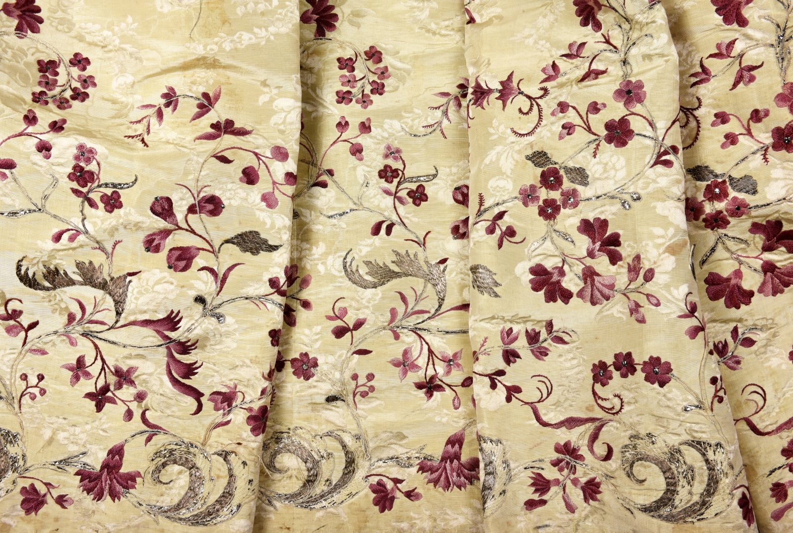 Kjolens nederkant med omfattande broderier i silke och silvertråd på mönstervävd sidenrips.