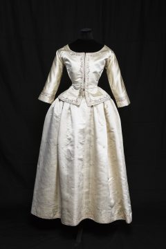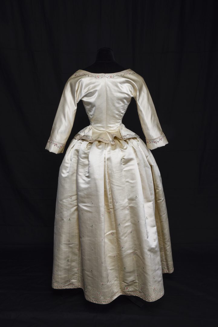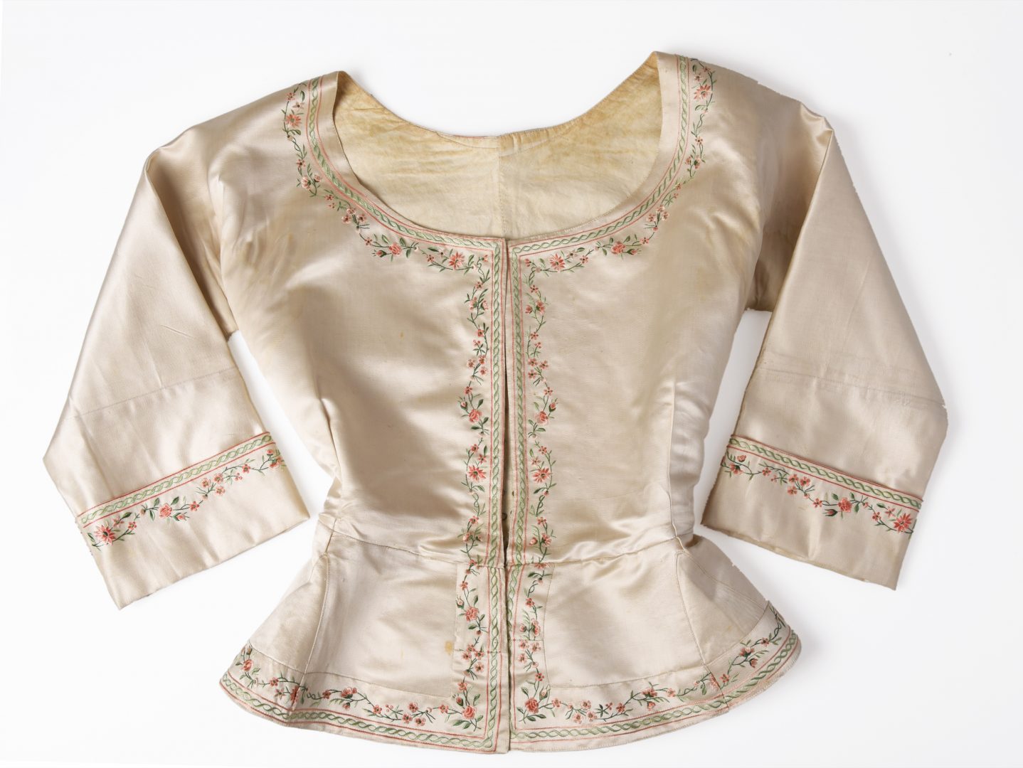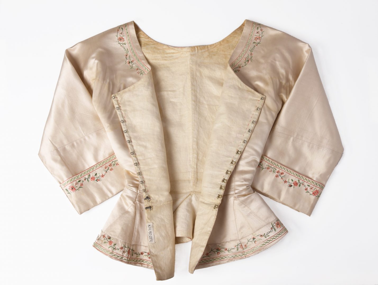På 1700-talet kallades kvinnans jacka för kofta. Här är midja och höfter särskilt betonade. Både kofta och kjol är omsydda, kanske vid flera tillfällen. När dräkten var så här påkostad ändrades den för att följa med i modets svängningar. Återbruk fanns redan på 1700-talet.