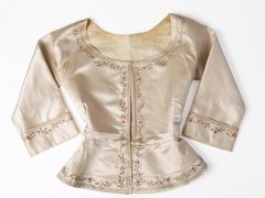 En kofta och kjol av sidensatin. Koftan har linnefoder. Blommor, kvistar och flätbårder är broderade i schattersöm och stjälkstygn i silke.