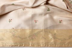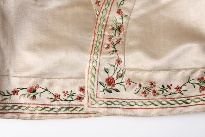 Koftans främre nederkant. Broderiet i schattersöm och stjälkstygn är skarvat för att passa skörtets form. -
